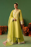 A beautiful parrot green outfit in Korean Raw Silk fabric, paired with an Organza dupatta. The neckline is adorned with exquisite patchwork, intricate embroidery, and delicate hand embellishments, while the bell sleeves add a graceful flair. Finishing touches of Chattapati on the sleeves and pant hems are elevating the whole look.