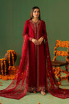 Deep maroon front-open long gown, paired with sleek straight cigarette pants, exudes classic grace. In Korean Raw Silk, this outfit is beautifully detailed with intricate hand embroidery and embellishments gracing the neckline and sleeves, with four-sided detailed borders on an Organza dupatta, making it a perfect statement piece for festive occasions.