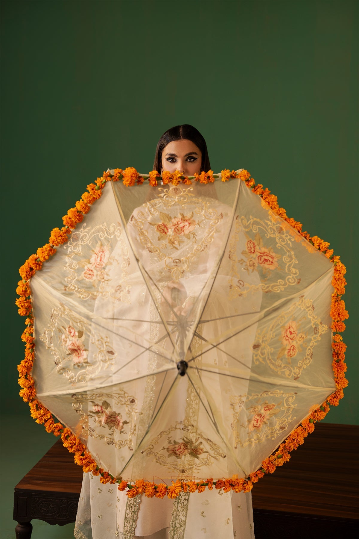 Leena is timeless beige outfit having a full-length shirt adorned with detailing of Swarovski crystals, pearls, cut dana, sequins, and gota lace. The design highlights a heavily embellished neckline and cuffs. In Tassar Silk fabric, paired with azar pants featuring delicate embellishments along the rounded hem. Completing the look is a beautifully crafted organza dupatta, intricately detailed all over, adding a touch of pure grace.