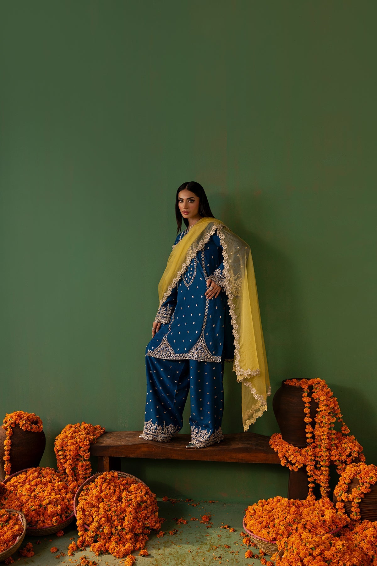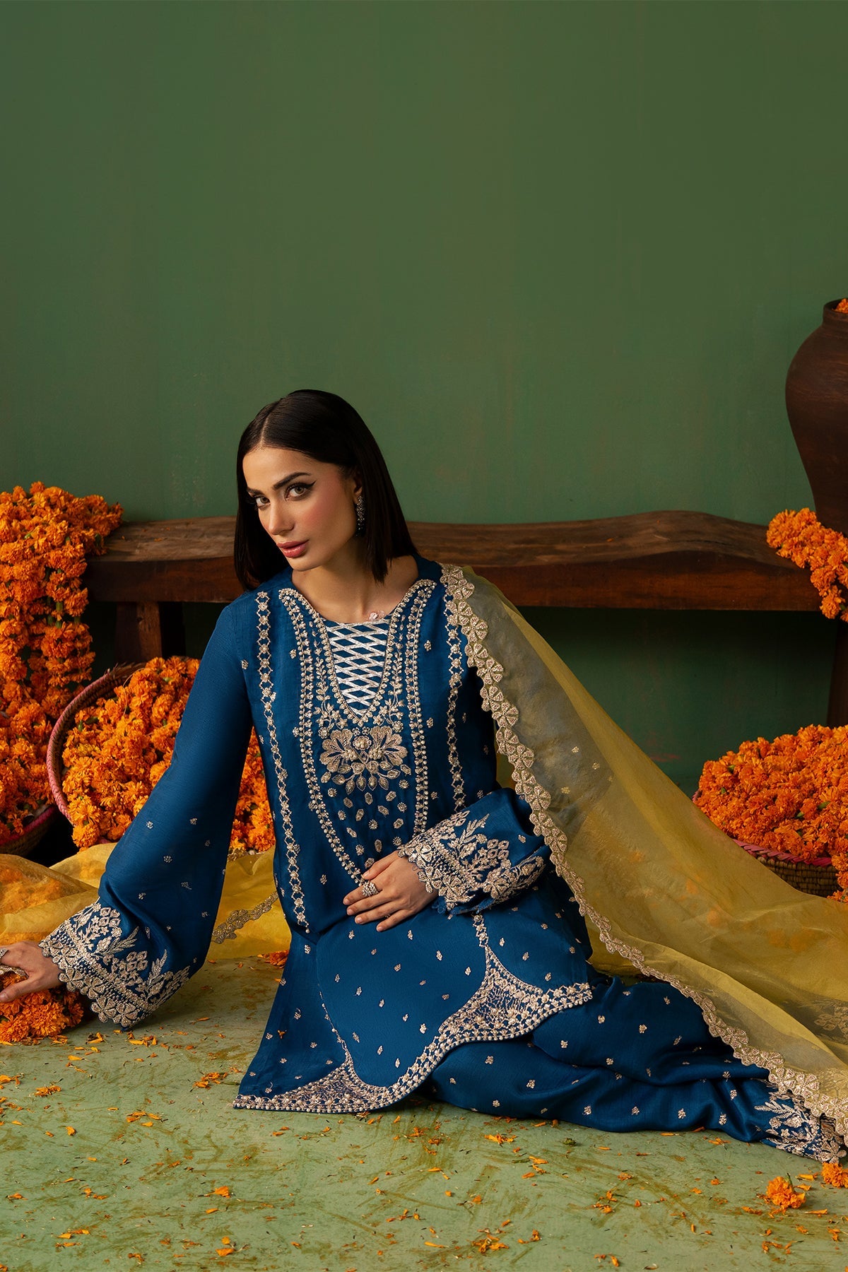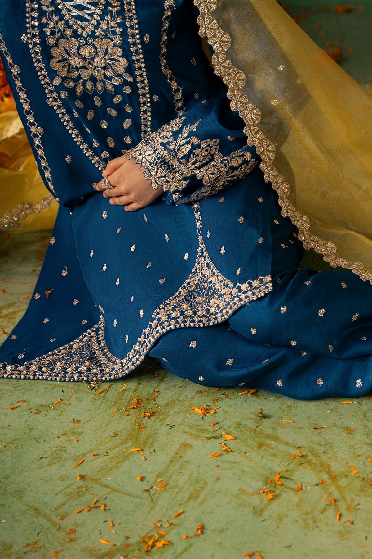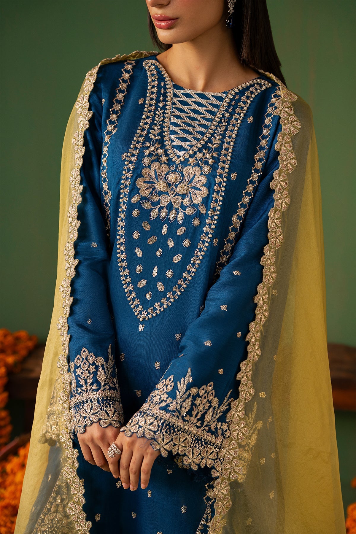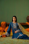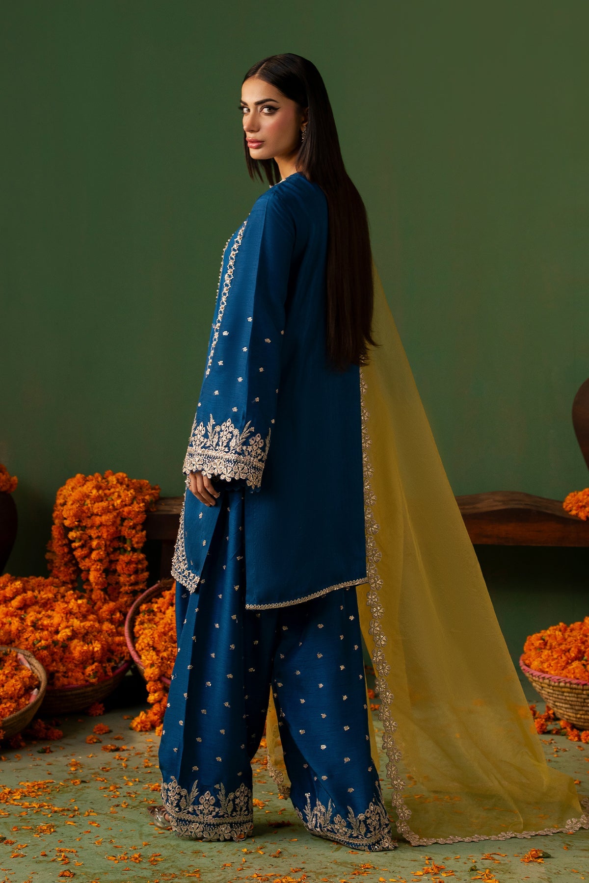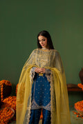 Raynah is an eye-catching cobalt blue outfit featuring a short Tassar Silk shirt paired with a trendy shalwar, with detailing of sequins, Swarovski crystals, cut dana, and gota work. The sleeves, borders, and neckline are beautifully enhanced with intricate embroidery and delicate hand embellishments. Completing the look is a contrasting yellow Organza dupatta, finished with finely detailed borders that perfectly complement the vibrant and contemporary grace of the outfit.