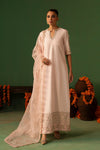 In a very elegant tone of baby pink, this graceful outfit features a full-length Tassar Silk shirt adorned with delicate detailing of pearls, Swarovski crystals, cut dana, sequins, and intricate lacework. Paired with matching cigarette pants and complemented by an Organza dupatta with subtle embellishments, Veyra is an absolute grace and sophistication.