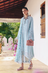 Aqua drop corner cotton collared shirt featuring a keyhole detail and bow tassels. It showcases contrast floral embroidery throughout the garment. The sleeves are bell-shaped with lace details and cutwork. The hem is finished with cutwork and bordered with laced handmade details.