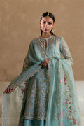 - An aquamarine organza paneled angharaka peplum with crew keyhole neckline, tassel detail, gold and beige lace, fitted sleeves, cutwork, and sequin-edged floral screen print.