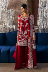 Cherry Red mid-length shirt made of raw silk with a moon neckline. The shirt features intricate handwork and ornamentation throughout, with the embroidery creating a flourish at the hem. It has fitted sleeves that are adorned with lace and decorative pearls.