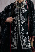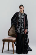 Organza, jet black cape with black and white embroidery, lacework, sequin border, and a contrast red strip with gold motifs.