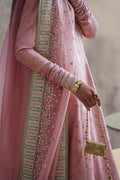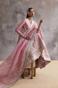 Tea rose pink organza dupatta with four-sided gotta work and geometric leave motifs.