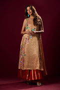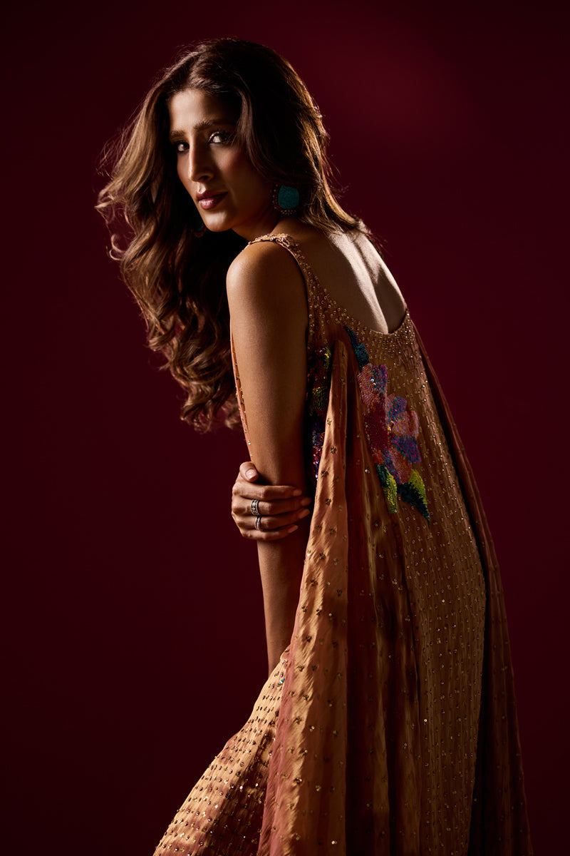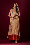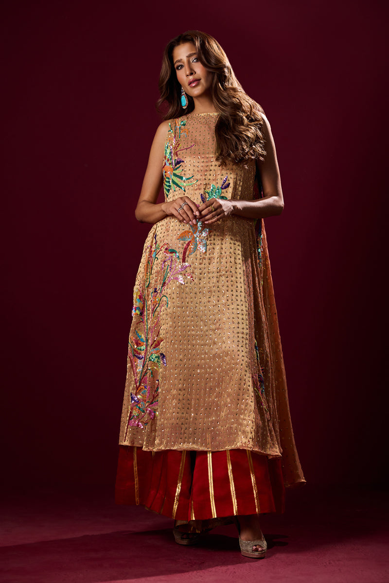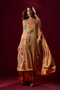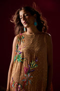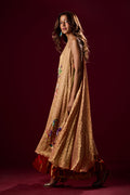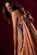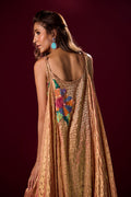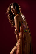 A masterpiece of elegance and vibrance, this peach-toned ensemble is adorned with intricate, colorful embroidery that dances across the fabric, blending tradition with modern artistry. The play of textures and hues creates a rich visual tapestry, highlighting the craftsmanship that goes into every stitch.