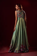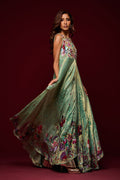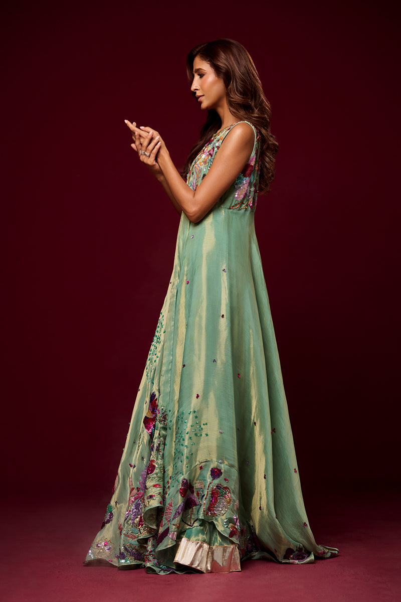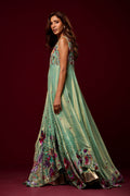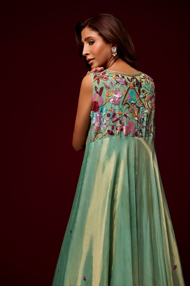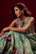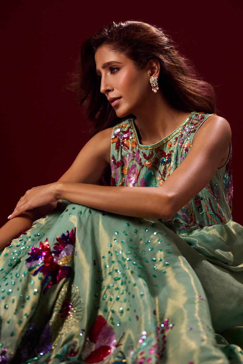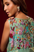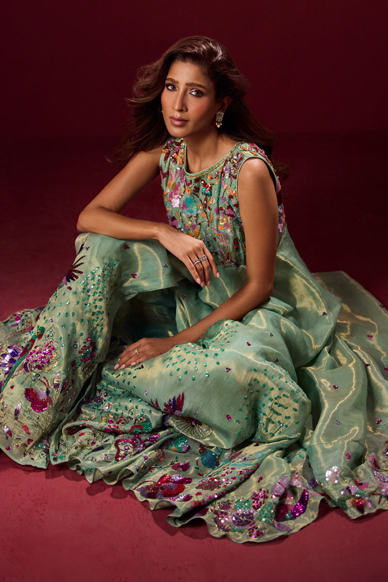 n ethereal vision in mint green, this ensemble is crafted from soft pure tissue with flowy silhouettes that move gracefully with every step. Paired with elegant monotone pants, the look is elevated with heavy hand embellishments, each detail meticulously handcrafted to create a striking balance of tradition and modern refinement.