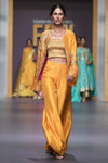 Mango yellow silk jacket embroidered with shikargah in zardozi finished with organza ruffled sleeves. Bootleg yellow silk trousers and smoked tissue bustier complement the elaborate jacket.