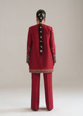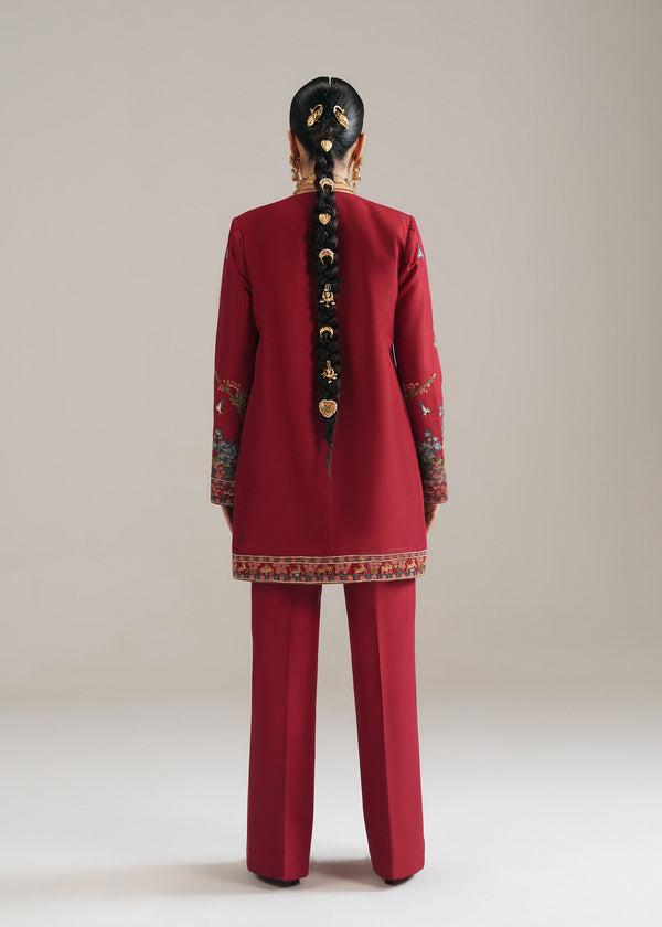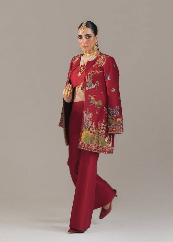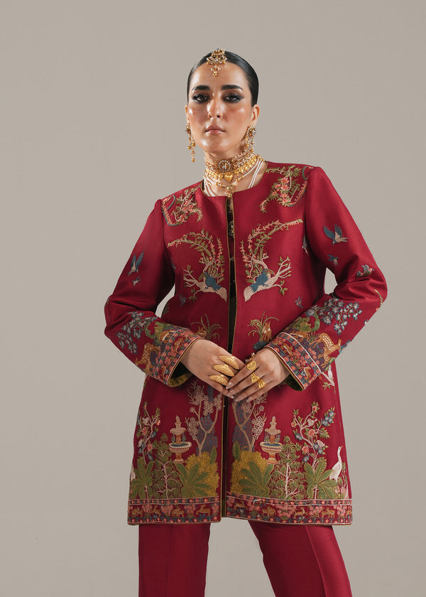 This red modern short jacket is a true symbol of today's fashion era, where heritage meets innovation. Crafted from pure raw silk, it radiates luxury and sophistication. The jacket is adorned with intricate Shikar gah embroidery, reimagined with a modern aesthetic that celebrates timeless craftsmanship. Every stitch tells a story of tradition, while the bold silhouette reflects the passion and pure love for contemporary fashion. A perfect blend of elegance and artistry, this jacket is more than just an outfit€”it's a statement of style.
