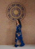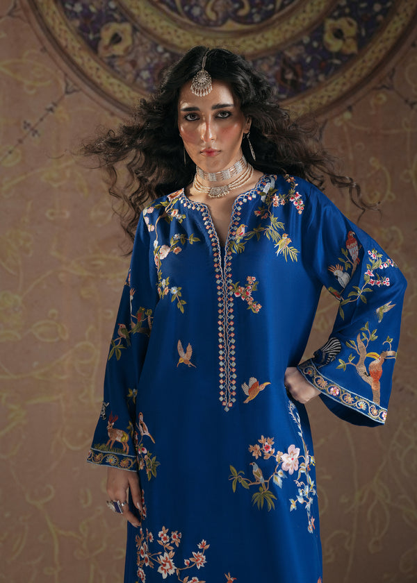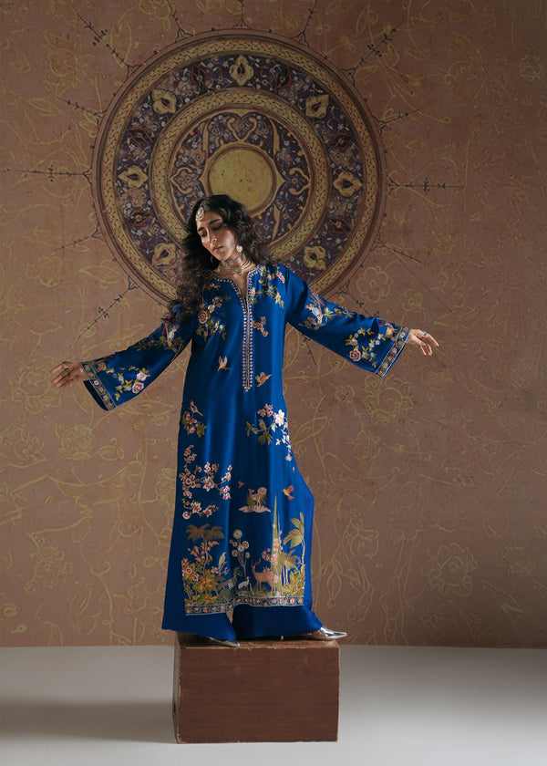 This stunning ensemble is crafted from pure raw silk, exuding elegance with its natural sheen and luxurious drape. The design is adorned with intricate embroidery inspired by Shikargah artistry, depicting a timeless narrative of flora and fauna in vibrant threadwork. The deep royal blue base enhances the detailed motifs of birds, animals, and nature, creating a regal and sophisticated look. Paired with wide-legged raw silk trousers, the outfit strikes the perfect balance between tradition and modern refinement€”for making a bold cultural state.