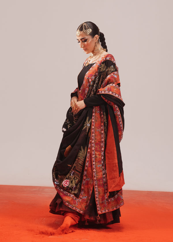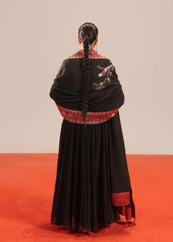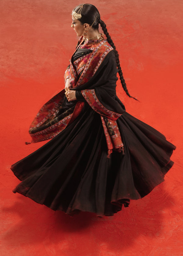 A timeless ode to tradition with a modern twist €” this black Peshwas ensemble is crafted in voluminous cotton net fabric, inspired by the grandeur of the old Peshwas silhouette. Its flow and structure embody elegance while retaining a sense of heritage. Paired with it is the statement Roomi Shawl, designed in pure raw silk with delicate sheesha silk borders. The shawl features modern embroidery that beautifully contrasts with the classic peshwas, bringing a touch of luxe craftsmanship. This ensemble harmonizes the past and present, making it a perfect reflection of artistry and sophistication.