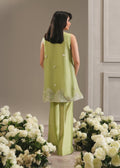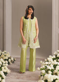 This pure raw silk double layered jacket is the epitome of understated elegance and timeless allure. In a soft mint-green hue, the serene silhouette is elevated with intricate white embroidery tracing the neckline and hem. Paired with sleek straight pants, the ensemble exudes effortless sophistication and refined charm.