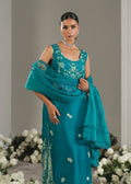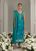 A statuesque silhouette rendered in pure ocean blue raw silk, appliqued with serene simplicity. The round neckline falls into a delicate beaded embroidered detail, a nod to couture embellishment. The surface is alive with tonal embroidery in ocean blue, tracing arabesque florals and lace work. The intricately detailed neckline is finished with beaded cut dana and sequences for a touch of movement, making it an expression of modern refinement veiled in timeless grace.