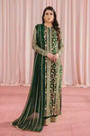 Deep emerald green heavy linear pattern shirt with wide legged pants and embroidered chiffon dupatta.