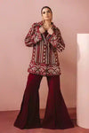 Heavily embroidered maroon front open jacket with raw silk separate inner, paired with flared pants.