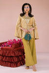 Sequinned tailored lime green front open jacket with wide legged pants and inner.