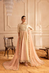 A beige and peach peshwas with dual- tone panels, intricately embroidered, paired with beige choridaar and peach embroidered dupatta with hangings
