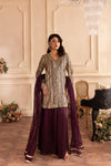 Plum embroidered chiffon shirt with contrasting embroidered silk borders on front and hem, delicate hand work motifs on sleeves, paired with silk pants and crushed organza dupatta