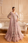 Pink embroidered organza peshwas with delicate hand work on panels and sleeves, paired with chiffon ruffles dupatta including with hand work belt