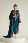 A rich teal green chiffon long shirt adorned with vibrant embroidered details, paired with a matching chiffon dupatta and plain trousers for an elegant, refined look.