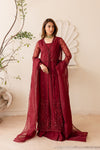 A deep maroon embroidered front open gown with embellished front and sleeves, paired with raw silk maxi and organza dupatta