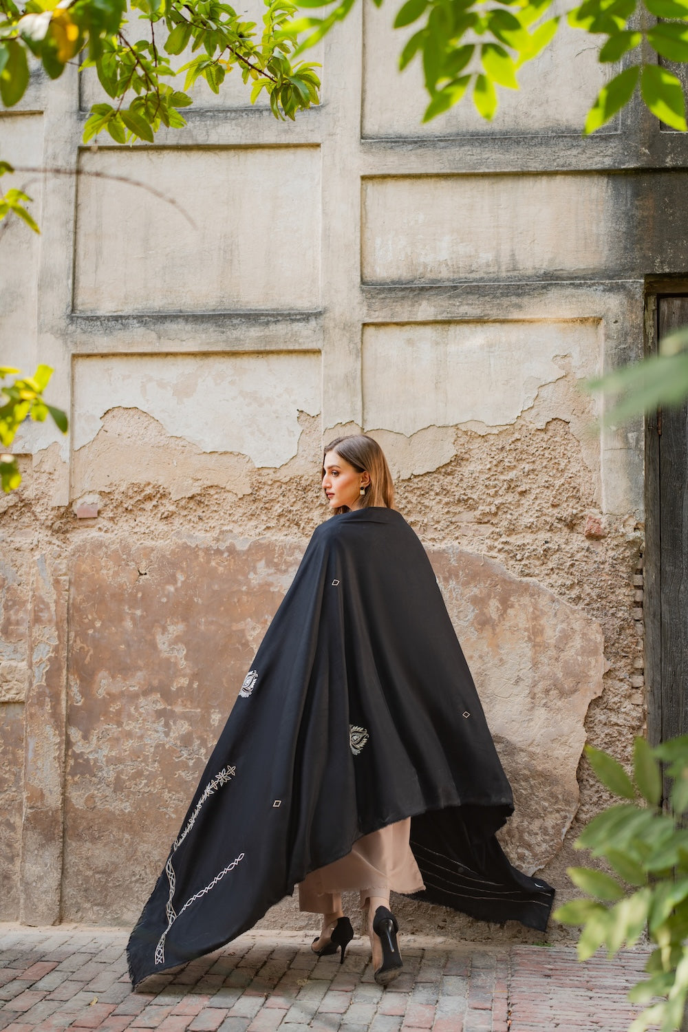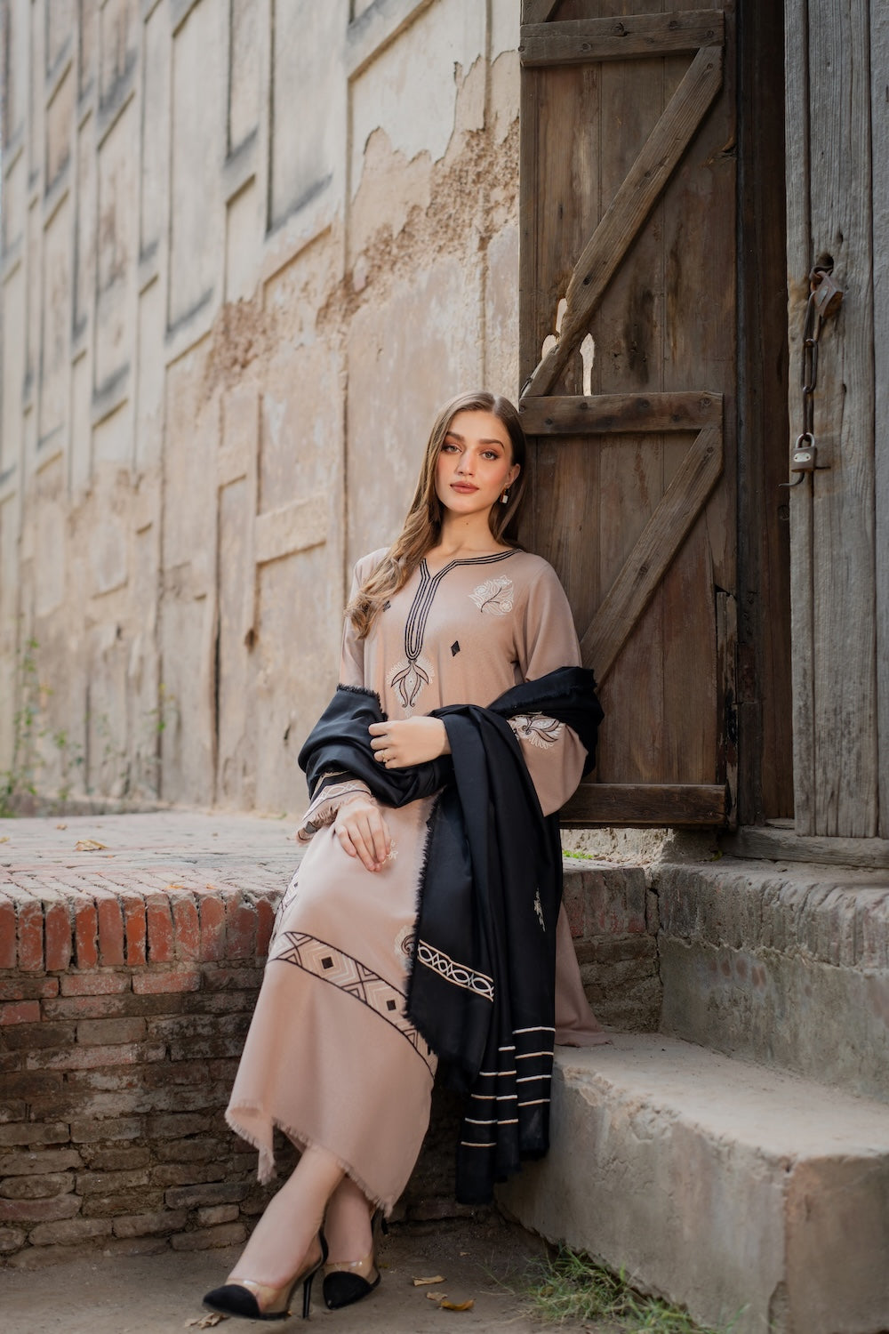 A hand‑worked beige masterpiece, Aayla dazzles with intricate black & white embroidery that defines its motifs and elevates the neckline. Paired with a black karandi shawl, also richly embroidered, it’s the perfect winter‑season statement.