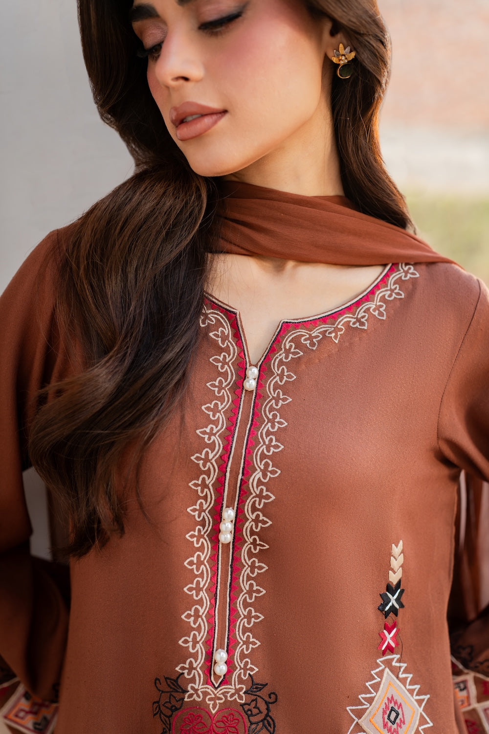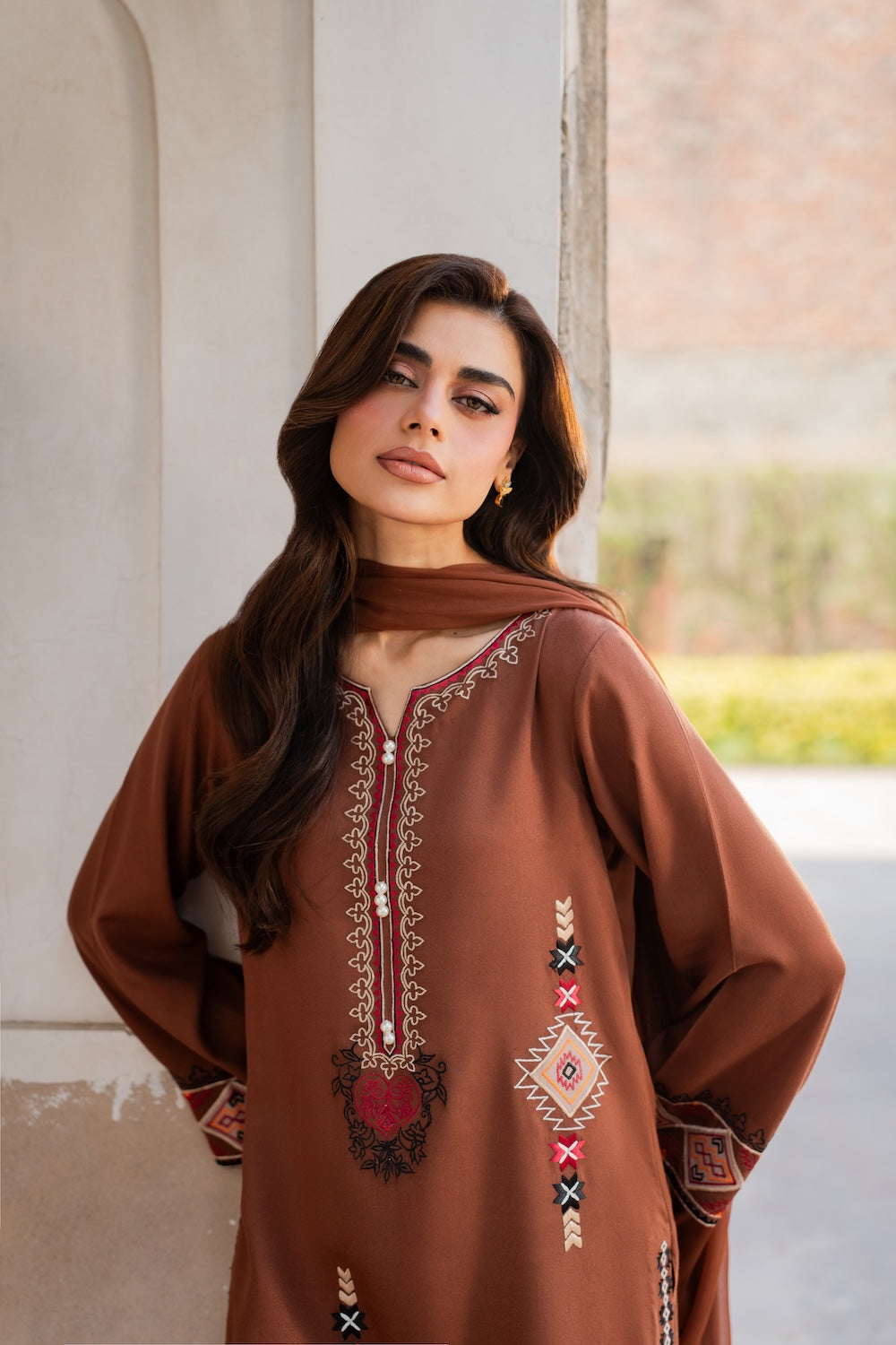A dreamy confection of karandi, rendered on a burnt orange base embellished with mesmerizing embroidery in monotones resham thread on a geometric setting. Accompanied with perfectly tailored pants with immaculate stitching details and intricate floral embroidery on the overall shirt and sleeves, this statuesque design ideal for your all festive season.