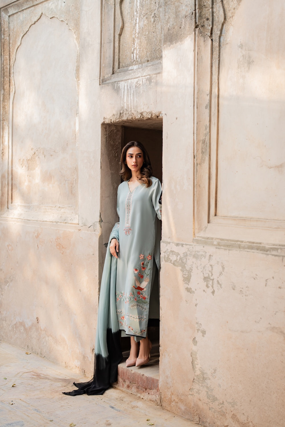 Turn heads this winter with an ice‑blue straight shirt that dazzles—intricate embroidery of gorgeous flowers and birds, accented with just a hint of peach and black. The look is crisp, elegant, and totally unforgettable.