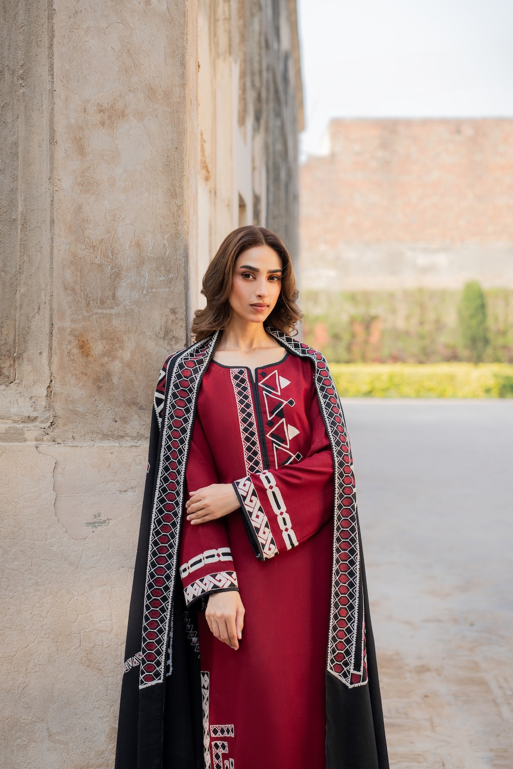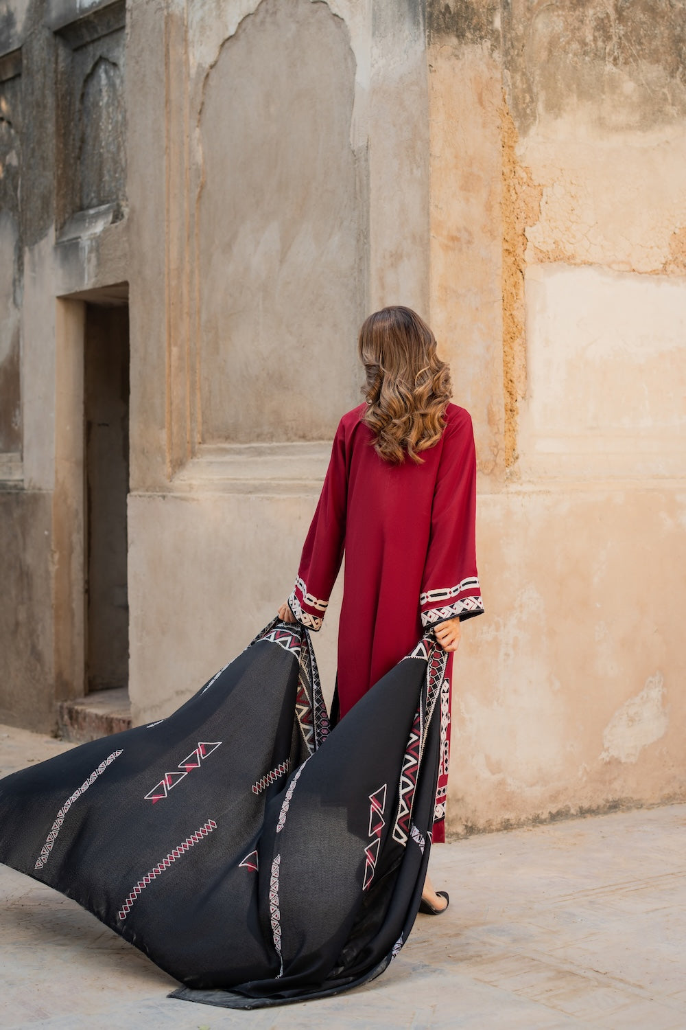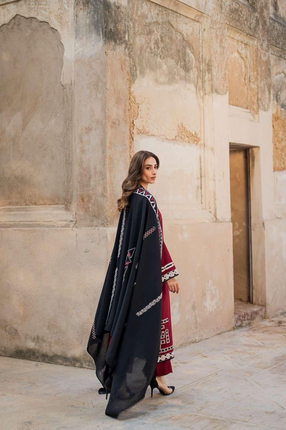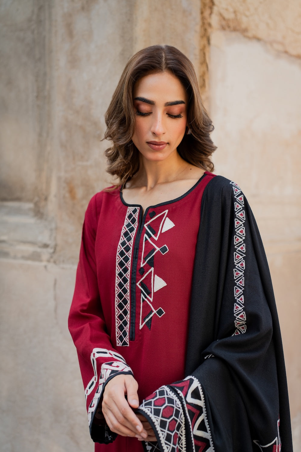 Pure karandi magic—this magnificent red outfit boasts balanced white and black aari embroidery on the front, a striking geometric pattern, and subtle detailing that makes it a wardrobe staple. Paired with straight pants and a majestic black shawl with embroidery, it’s the perfect blend of elegance and tradition.