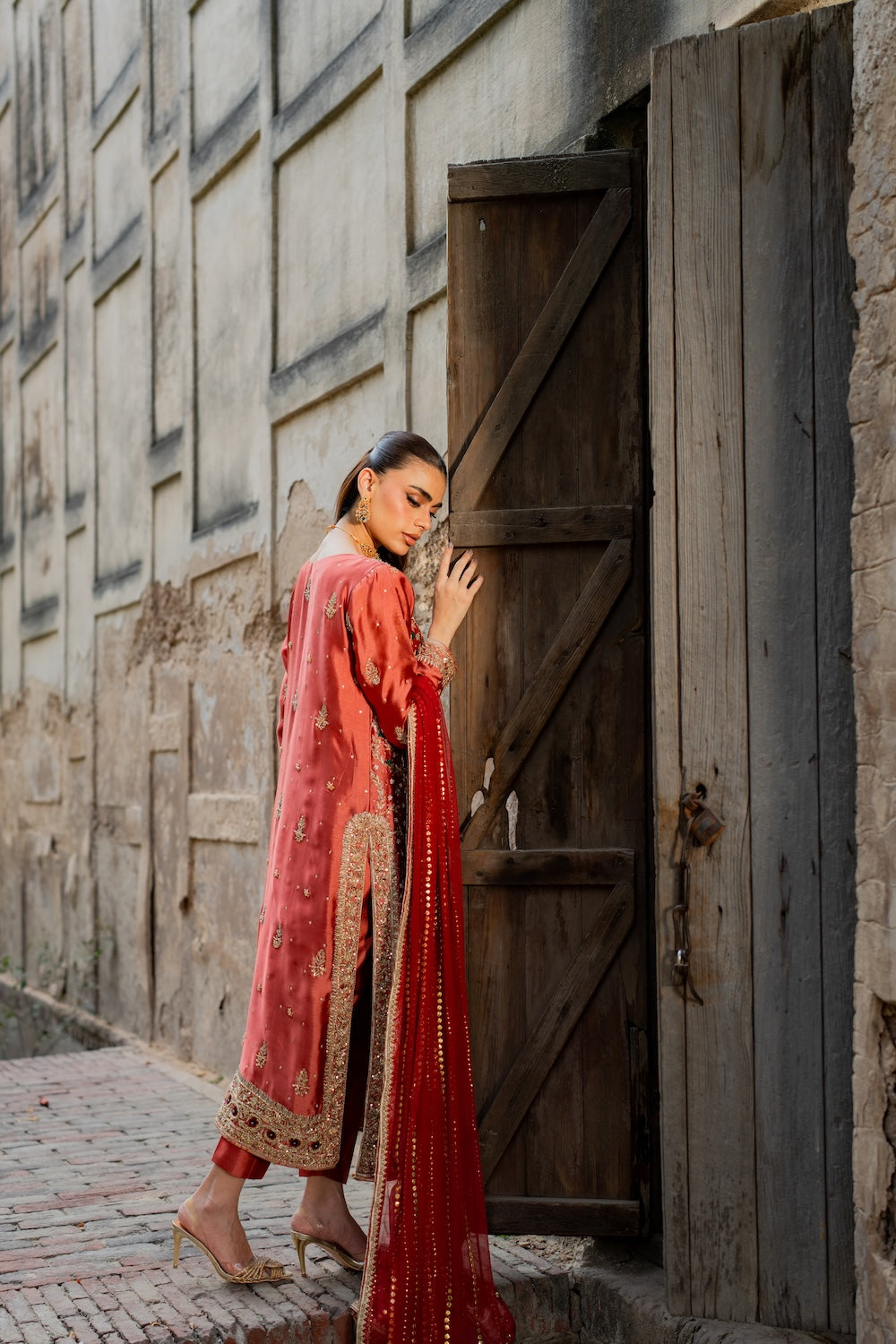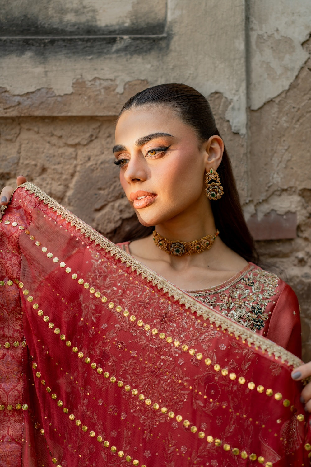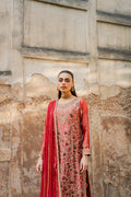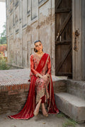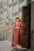 Anisah is a treasure! This coral ensemble dazzles with intricate dabka work, beautifully elevated by green and red threadwork accents. The fuller shirt paired with plain pants strikes the perfect balance, while a heavy dupatta completes this elegant, head-turning look.