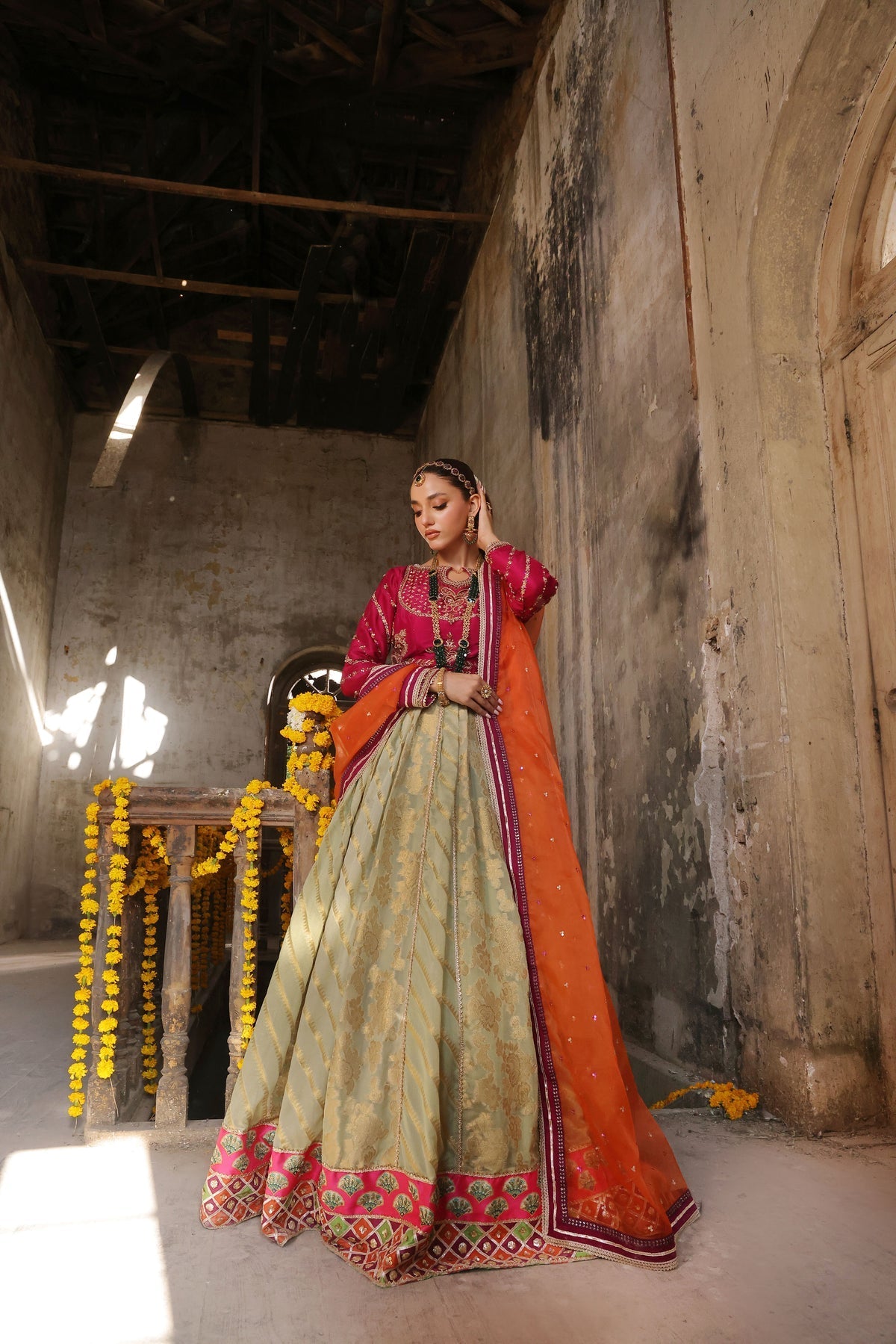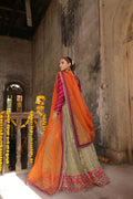 Lehnga is on chiffon banarsi fabric with gota panels. The border is digital printed embellished with stones, kora, dabka and sequins work all around.
