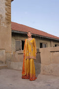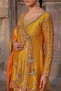 Mayoun yellow peplum shirt made on embossed sheesha silk; handworked with sequins, gota, resham and and stones work on the front and sleeves and the back is finished with gotta tussle.