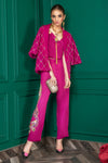 This formal jumpsuit and jacket look is created using different techniques featuring our signature dragon motif on the jumpsuit and geometric embroidery on the jacket. The jacket features intricate metallic stud and thread work. The formal jumpsuit has pleating and hand crafted dragon motif with intricate zardozi, bead and crystal work.