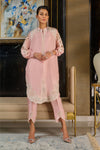 Primrose pink pure silk formal shirt with pure resham hand embroidery and heavy cut-work on front, back daman and sleeves. Paired with pure silk trousers with embroidery detail.