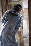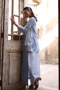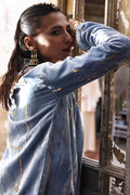 Paired with a pure velvet jacket in a rich Wedgwood hue, adorned with elaborate zardozi embroidery, crystal accents, and sequin detailing, the ensemble exudes effortless sophistication.