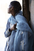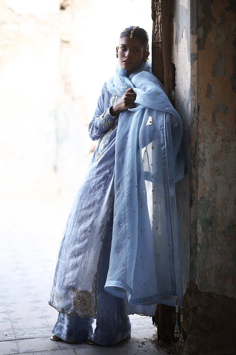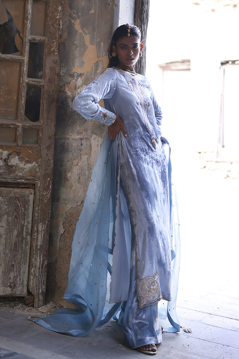A vision of timeless allure, this formal pure velvet ensemble in two-tone Wedgwood hues is crafted to captivate. Each piece is meticulously hand-embroidered with exquisite zardozi, sequin, and crystal work, adorned with our signature Chaand Bala applique motifs that define the brand's artistry.