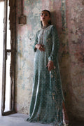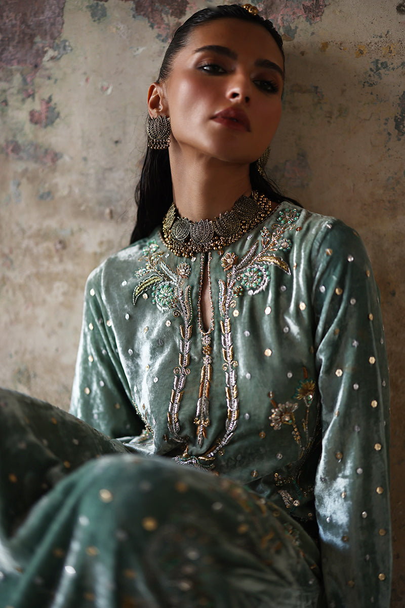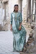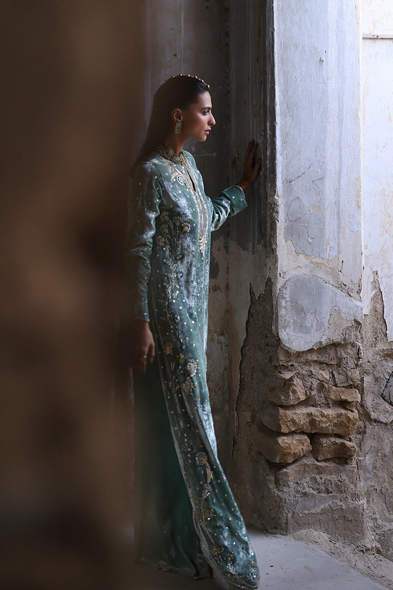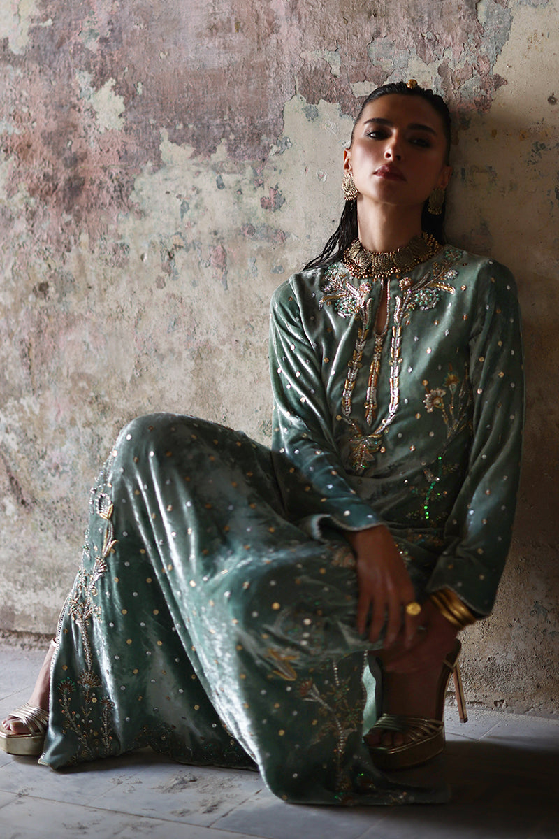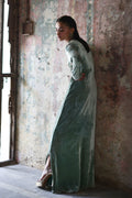 An embodiment of refined glamour, this stunning formal kaftan is handcrafted insmoky sage pure velvet, exuding richness and depth. Every inch is meticulously hand-embroidered with elaborate zardozi detailing, crystal accents, and sequin artistry, showcasing the mastery of timeless craftsmanship.