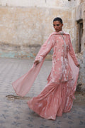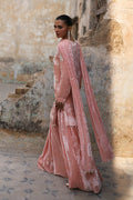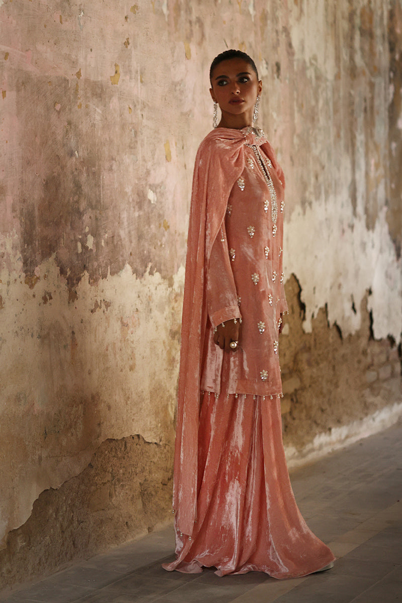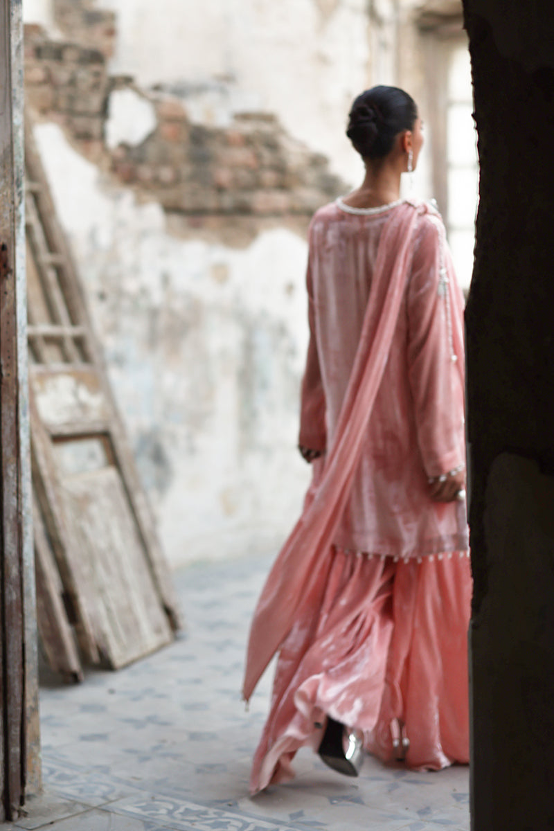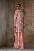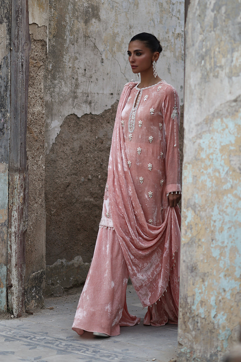 A celebration of intricate craftsmanship,this Pure Velvet ensemble in a beautiful Rose Quartz hue is beautifully hand-embroidered with zardozi, pearls, delicate pearl flowers, and shimmering Swarovski crystals, creating a look that's both regal and refined.