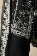 An enigmatic shade of ebony forms the canvas for Noctis, where moonlit geometry and delicate florals entwine in a dance of light and shadow. Lustrous ivory threads trace graceful patterns across the raw silk, as butterflies drift like fleeting dreams through the night sky. The look is completed with an ethereal organza dupatta, intricately embroidered in soft florals, and a tonal tapered shalwar finished with refined stitch detailing. Enigmatic, elegant, and endlessly captivating €” Noctis embodies the poetry of twilight, where silk shimmers like starlight and every detail whispers quiet luxury.