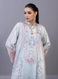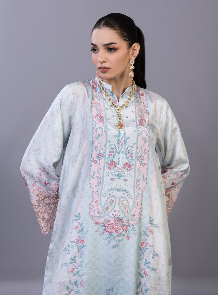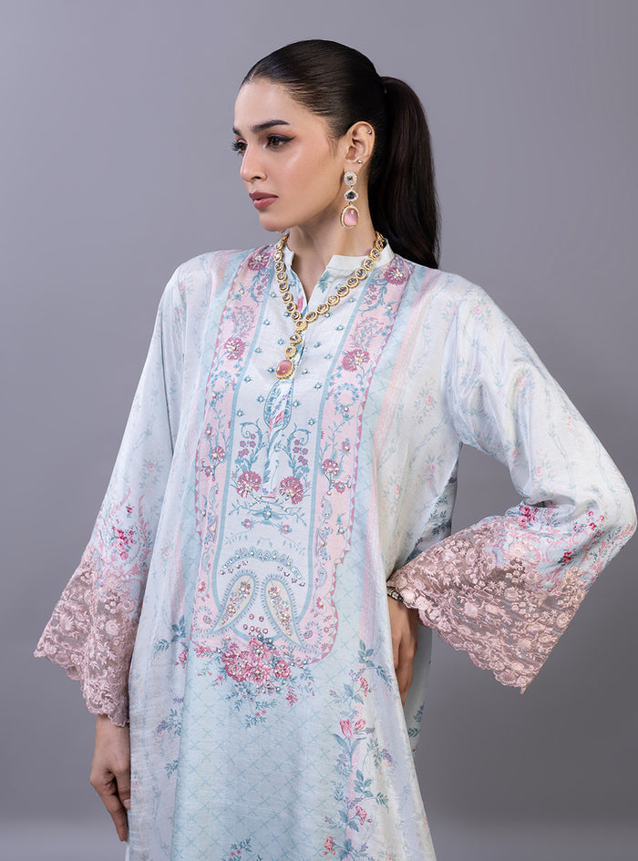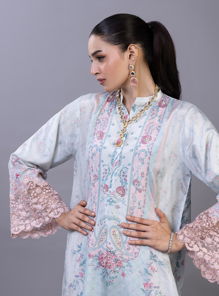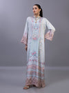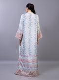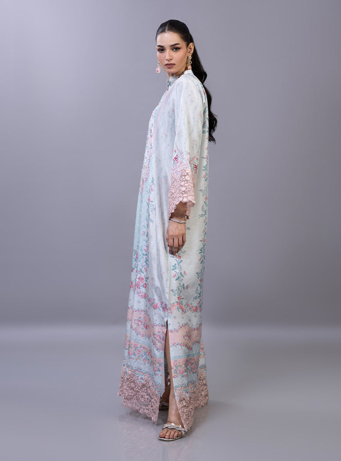 The kaftan features an ethereal, dream-like palette of sky blue and blush pink, adorned with a romantic floral print of sprawling rose vines and delicate floral medallions. The high-fashion design is elevated by dramatic, bell winged sleeves finished with intricate, hand-cut rose-pink lace that adds a layer of artisanal texture. With its effortless drape, sophisticated side slits, and a soft-focus print that bridges the gap between traditional heritage and modern luxury, this piece is a standout choice for high-end festive gatherings.
