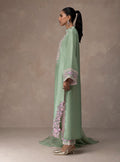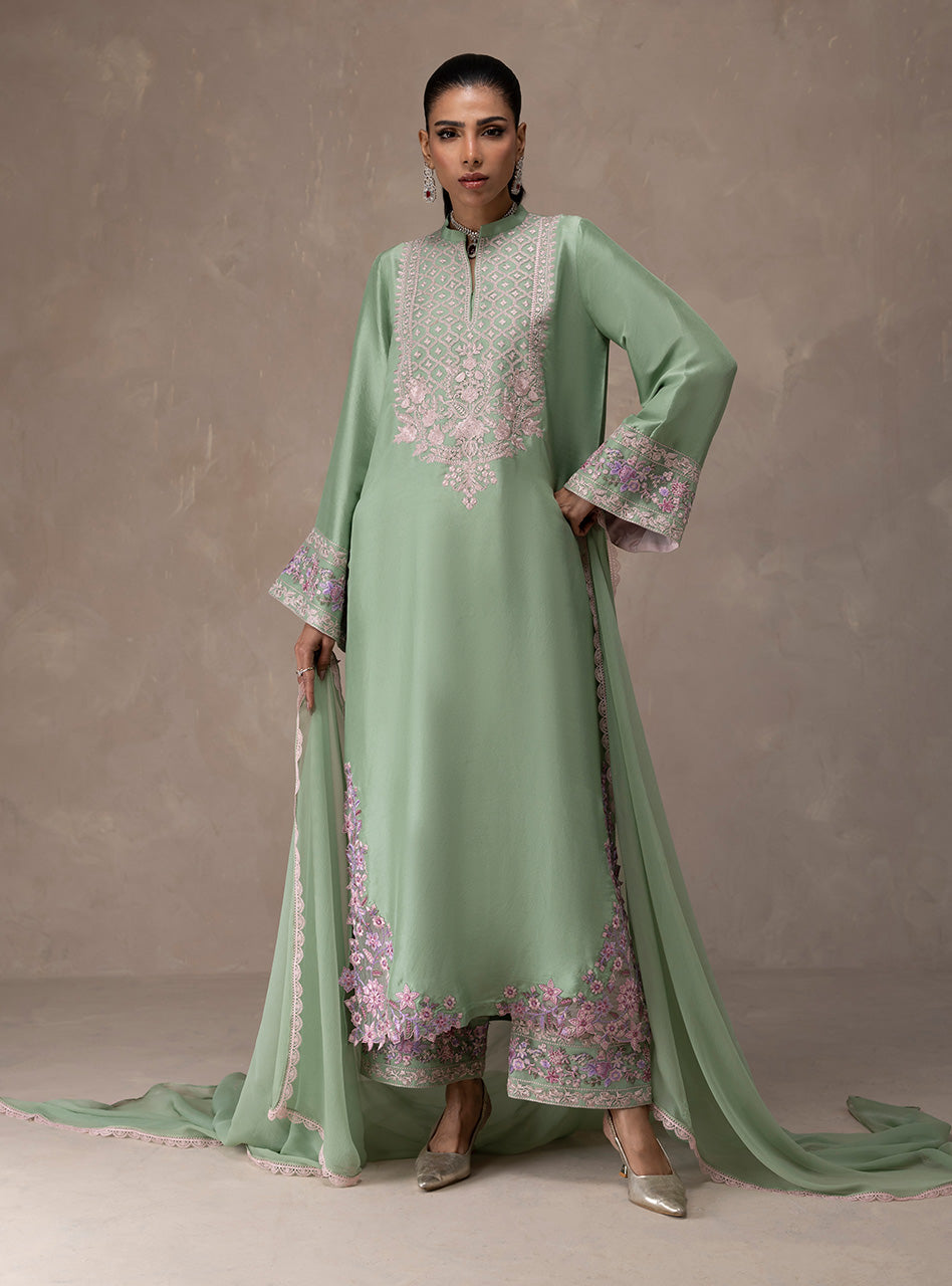 Radiate freshness this festive season in Lilac Bloom. This mint raw Silk shirt is a celebration of spring, featuring an intricate geometric neckline that flows into whimsical floral vines along the side slits. The sleeves are heavily accented with lilac and pink threadwork, adding a pop of color to the serene mint base. Paired with matching Silk pants and a lightweight mint chiffon dupatta, its a look that feels as breezy as it is beautiful.