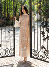 The soft beige chiffon drapes with a sensuous fluidity, creating a canvas of understated luxury. Delicate floral embroidery in muted pastels dances across the fabric, like a secret garden blooming under a soft summer sun. The intricate lace detailing adds a touch of ethereal grace, while the flowing silhouette accentuates the wearer's natural beauty.