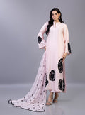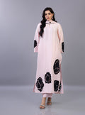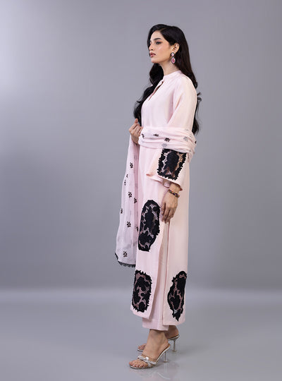 The long shirt is meticulously crafted from premium fabric, serving as a serene backdrop for dramatic, hand-placed black floral lace appliqués that create a striking visual rhythm across the hem and sleeves. This masterful contrast is mirrored in the matching dupatta, which features delicate embroidery and a refined lace border, perfectly pulling the look together. Paired with graceful wide-leg trousers, this outfit is the epitome of modern luxury, offering a poised and unforgettable aesthetic for your most cherished Eid celebrations.