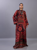 This kaftan is a flowing silhouette that drapes beautifully, offering a relaxed yet regal look. Drenched in a rich, multi-tonal print of earthy ochres, deep teals, and sunset reds, the kaftan is adorned with intricate traditional and geometric printed borders. The wide sleeves and floor-length cut provide a dramatic sense of movement, making it the perfect choice for an effortless Eid transition from daytime elegance to evening glamour.