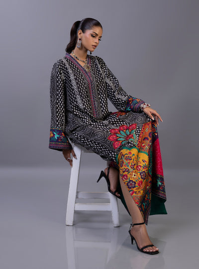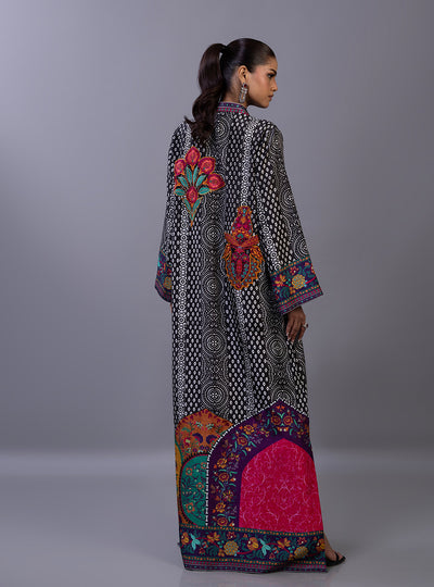 Command the room in this majestic floor-length printed kaftan, where classic monochrome meets a burst of festive color. The garment features an intricate, all-over white geometric dot print on a deep black base, creating a rhythmic and slimming visual effect. The relaxed, flowing silhouette and wide sleeves offer a regal drape, ensuring both comfort and a high-fashion edge. Perfect for evening celebrations, this piece is a masterclass in balancing traditional patterns with a bold, contemporary aesthetic