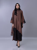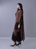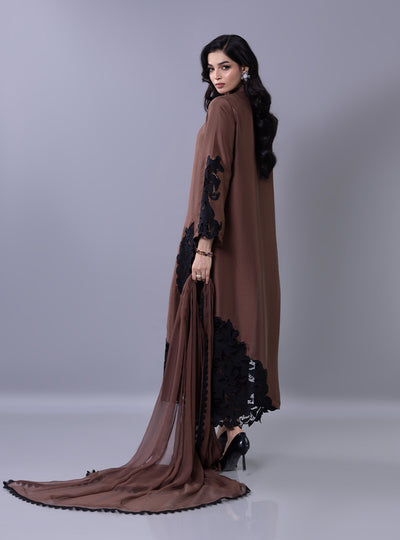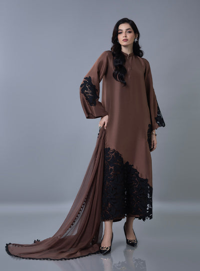 Elevate your festive look with this mocha-brown ensemble, a stunning blend of modern minimalism and bold detailing. The sleek shirt features a sophisticated band collar and hidden placket, providing a clean canvas for the dramatic black floral lace applique cascading across the hem and sleeves. Paired with a matching dupatta adorned with a delicate lace, this outfit offers a refined balance of traditional modesty and contemporary flair, making it an essential choice for your Ramadan and Eid festivities.