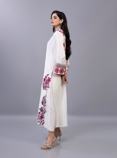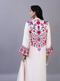 The shirt is masterfully detailed with a lush garden of crimson and fuchsia floral motifs that trail elegantly along the hemline and bloom across the shoulder in a sophisticated asymmetrical design. The sleeves feature intricate geometric borders paired with matching floral accents, perfectly complemented by a lightweight dupatta finished with a delicate magenta lace trim and matching pants. This exquisite piece balances a serene off-white base with high-definition embroidery, making it a luxurious choice for celebratory daytime gatherings and festive soirées alike.