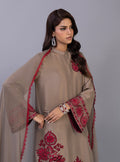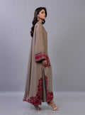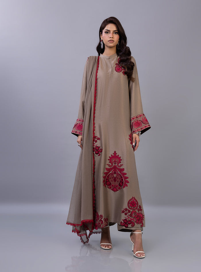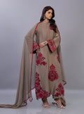 Exude an air of refined grace in this stunning taupe ensemble, a perfect fusion of muted elegance and fiery artisanal detail. The long shirt is meticulously crafted with a clean band collar and a hidden placket, serving as a sophisticated canvas for the bold, crimson-red embroidery that anchors the hem with majestic Suzani motifs. Intricate floral sprays adorn the shoulder and back, while the wide statement cuffs feature dense, traditional threadwork that adds a layer of heritage charm. Completed with a matching pants and a lightweight dupatta finished with a delicate red lace.