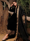 Indulge in a winter affair with this long black velvet shirt; heavily adorned with embellished neckline. The floral daaman is beautifully enhanced with intricate thread work and touch of antique gold kora dabka and sequins. It comes with black straight pants. The outfit is coordinated with black organza dupatta finished with jamawar and gota lace around the edges.